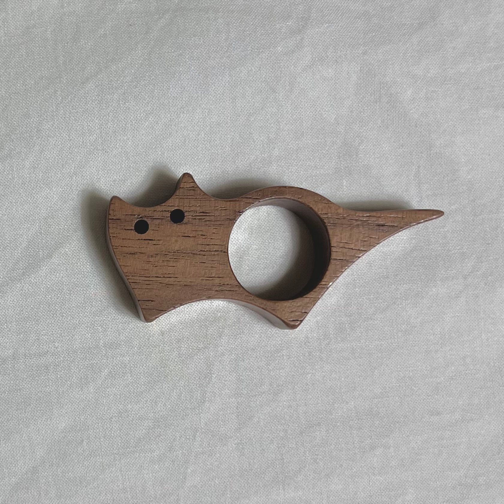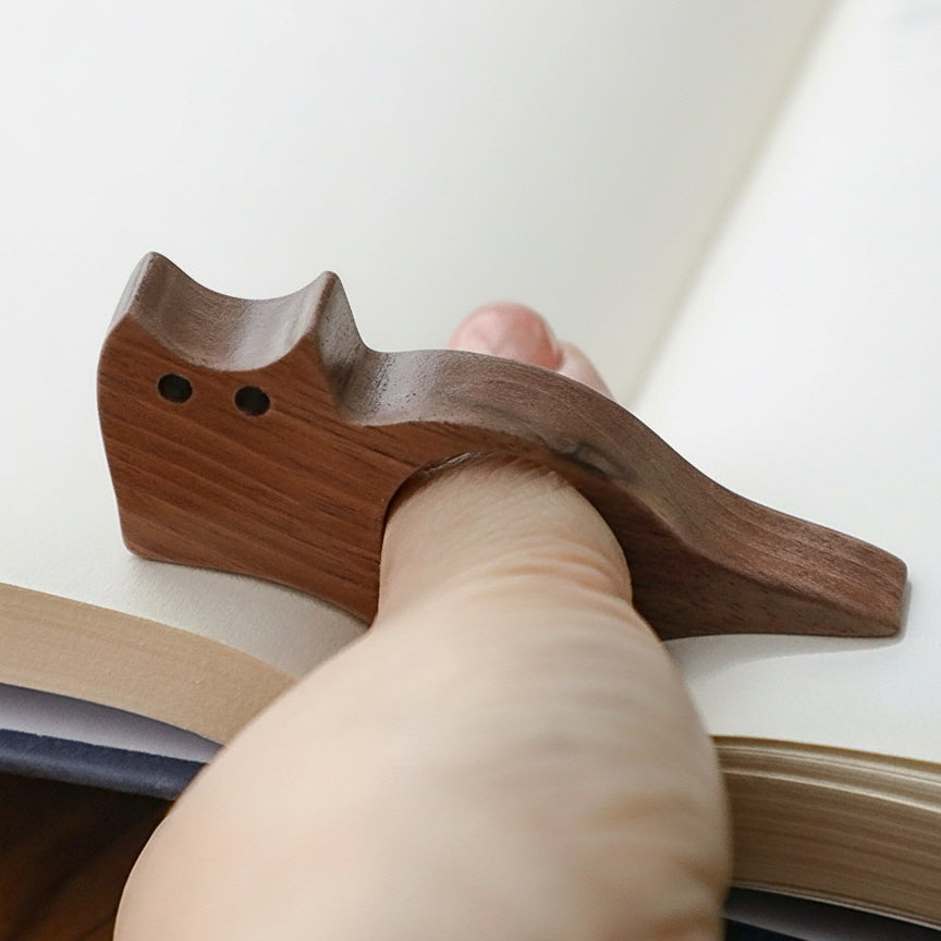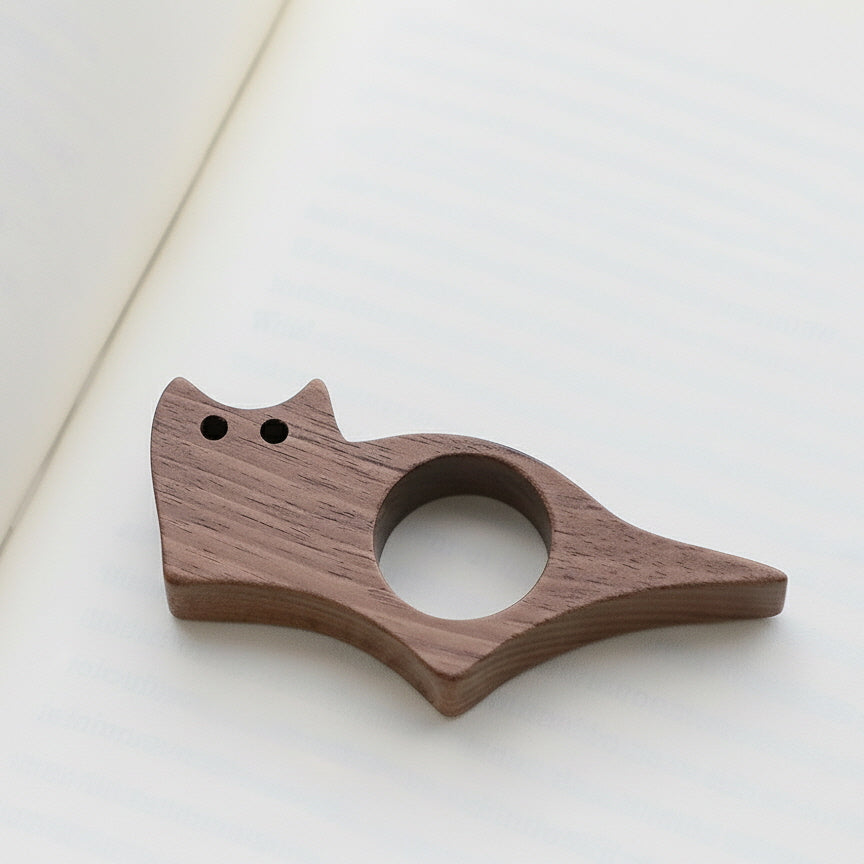 A cat-shaped wooden book holder ring made for quiet, focused reading moments.