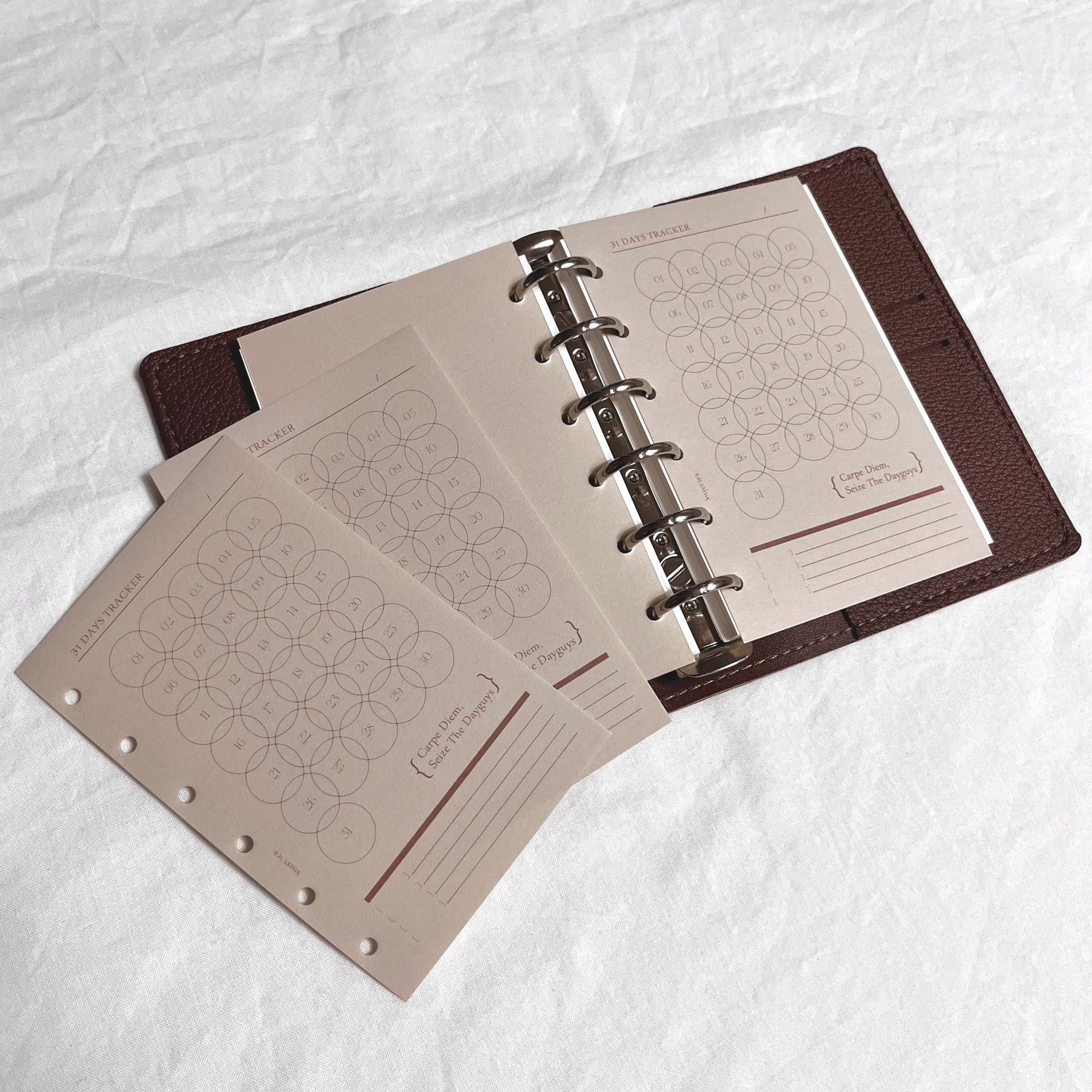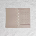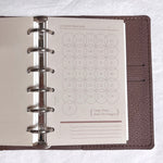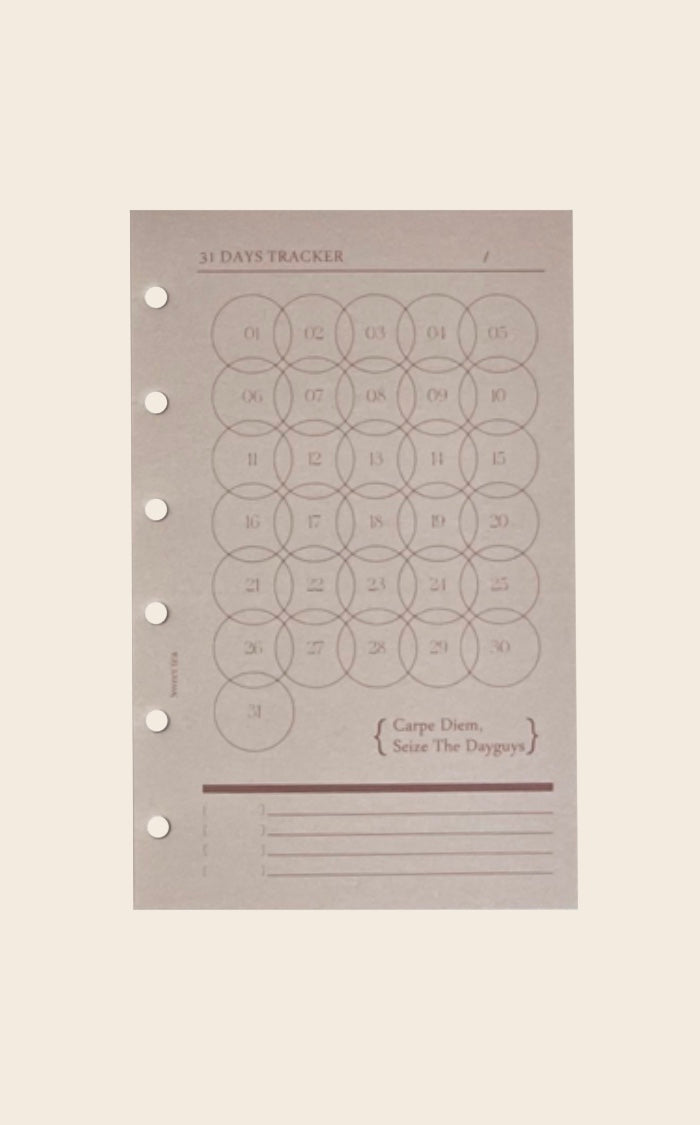 With 31 circular checkboxes, this A7 sheet lets you track a habit throughout the month at a glance. Its light size makes it easy to maintain consistency anywhere, and the memo area below is perfect for simple notes or reflections.